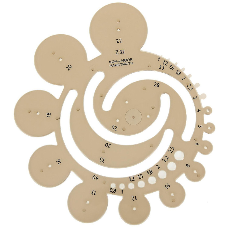 На шаблона има малки кръгчета с диаметър от 0.8 до 2.5 мм и външни окръжности с диаметър от 1 до 40 мм.